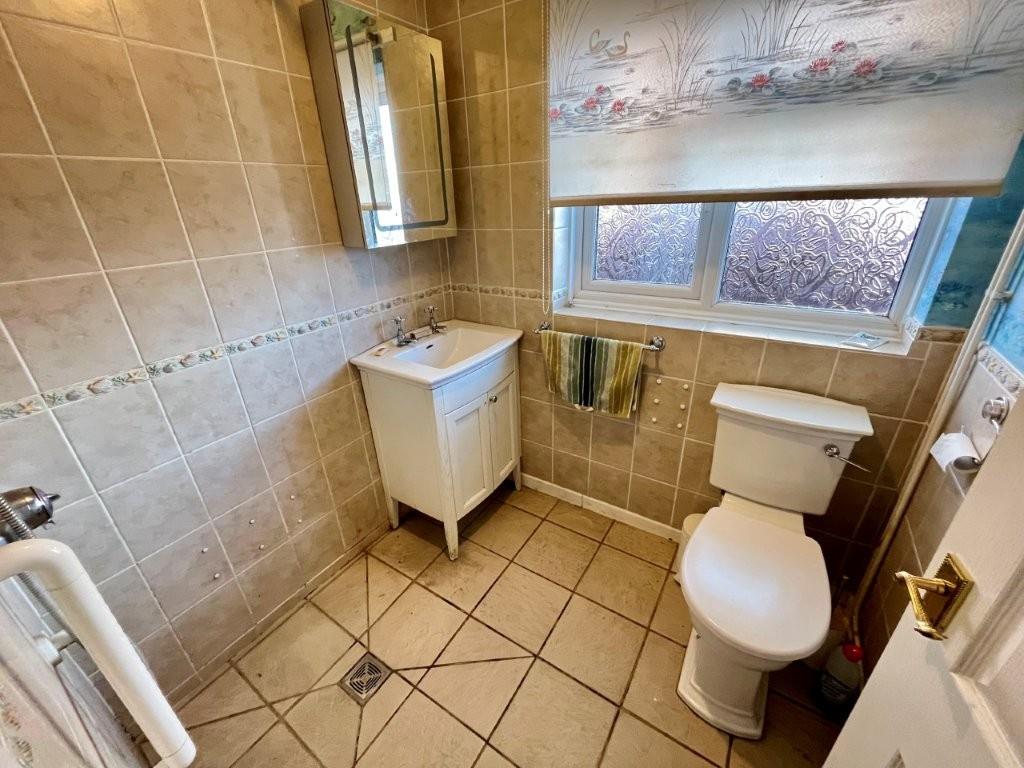 White suite comprising WC and vanity basin, wet room style shower with thermostatic controls and floor drain, tiled walls and floor. Obscure double glazed window to side aspect.