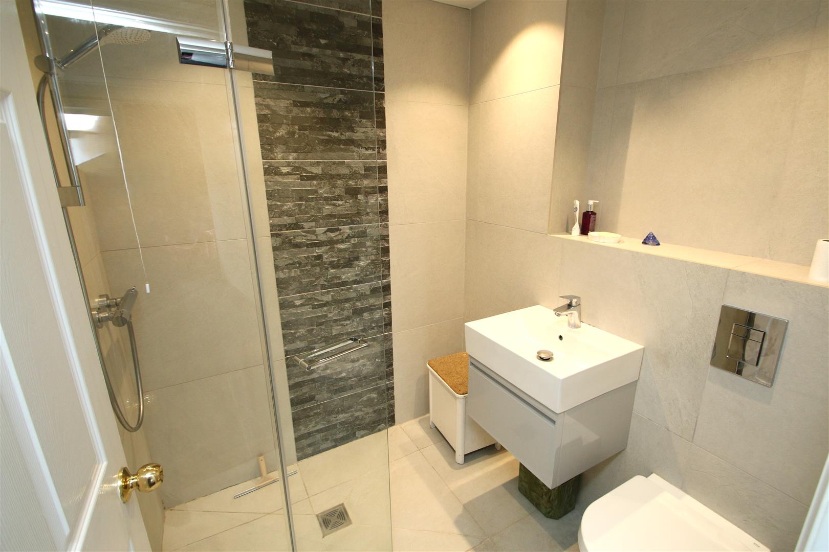 Motion detecting recessed lighting, shower, wash hand basin, low level WC, heated towel rail, tiled floor and walls.