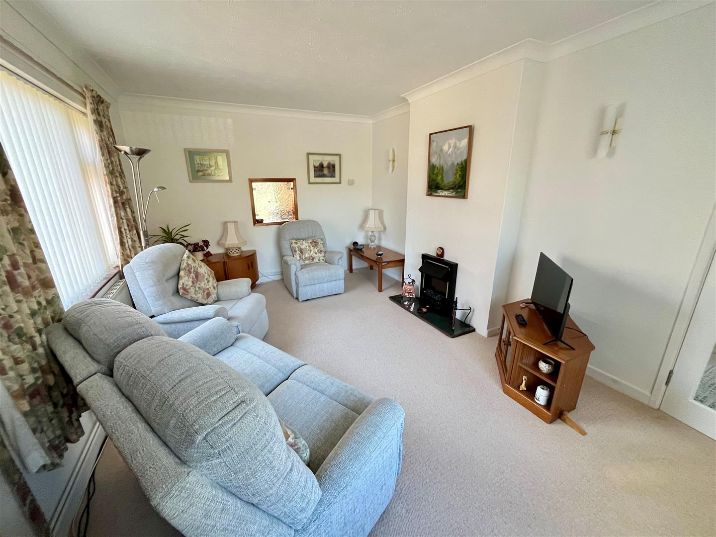 Double glazed window to front and side aspects, two radiators, feature fireplace with polished stone hearth and wall lights.