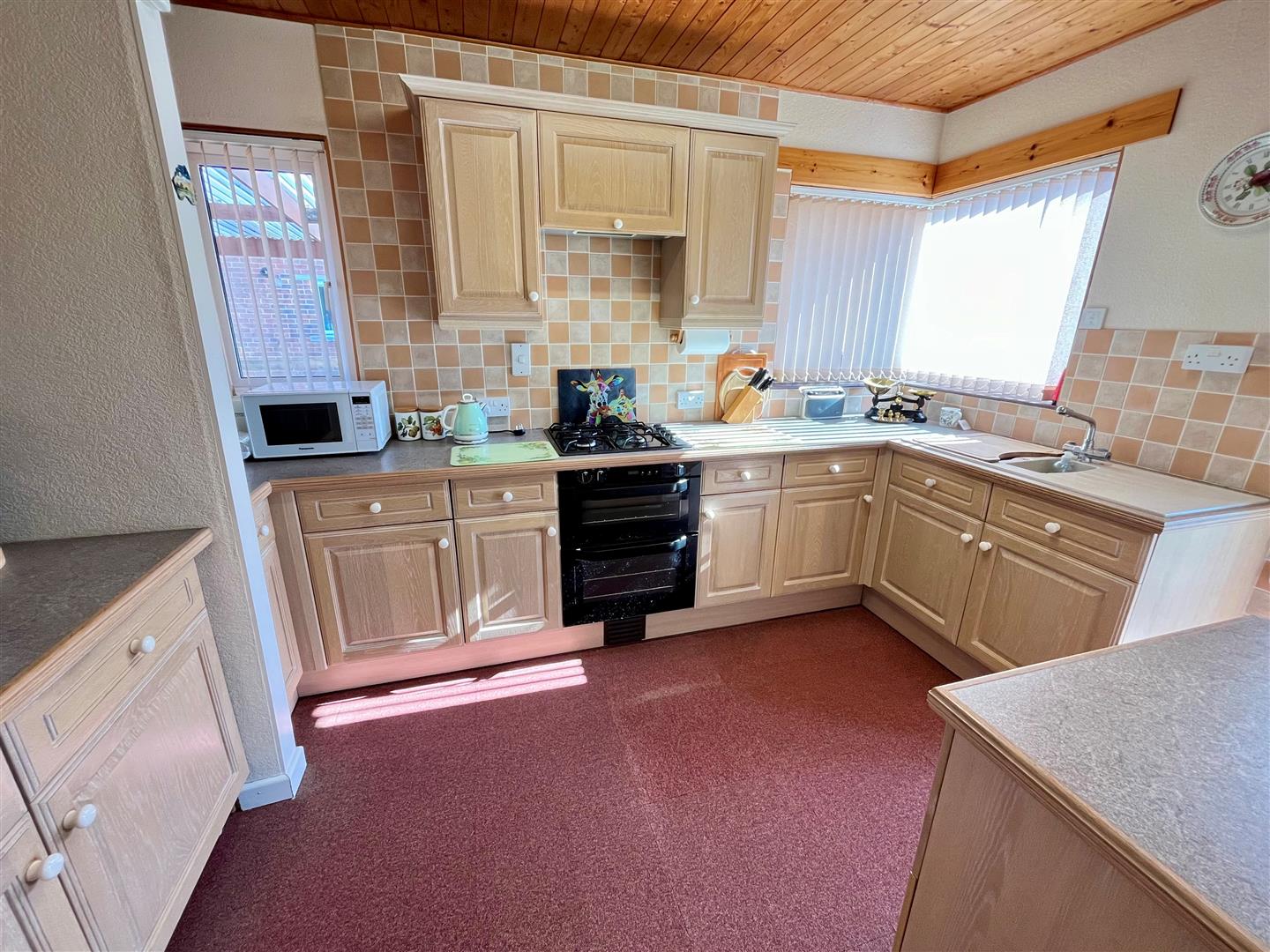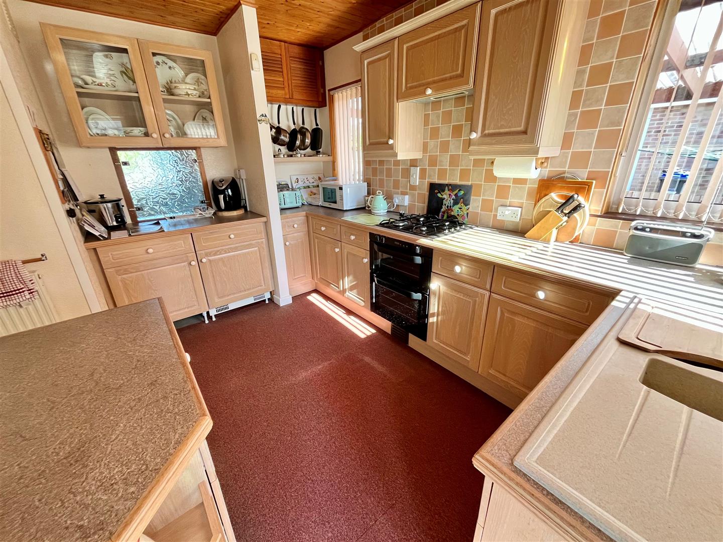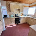Matching range of shaker style wall and base units with worksurface over. Inset gas hob with double oven under and extractor hood. Integral serving refrigerator and freezer, inset 1 ΒΌ bowl sink unit with mixer tap, tiled splashbacks. Double glazed windows to side and rear aspects and radiator. Part glazed door to: