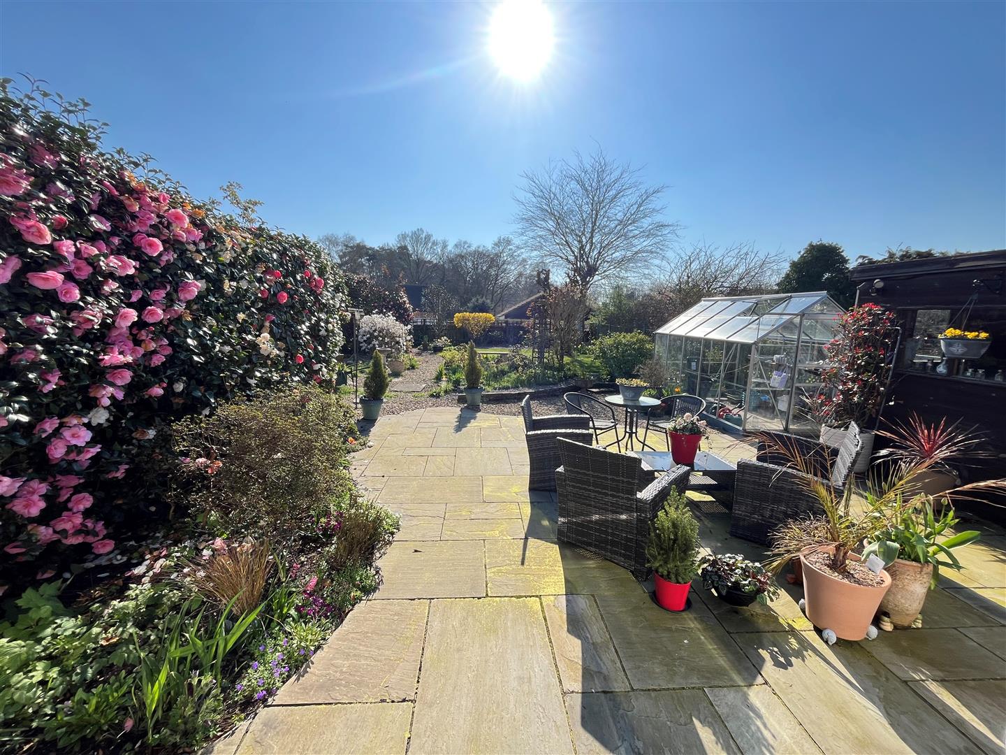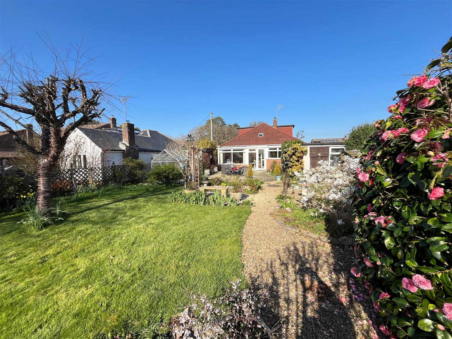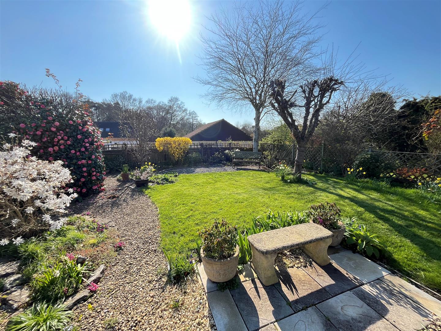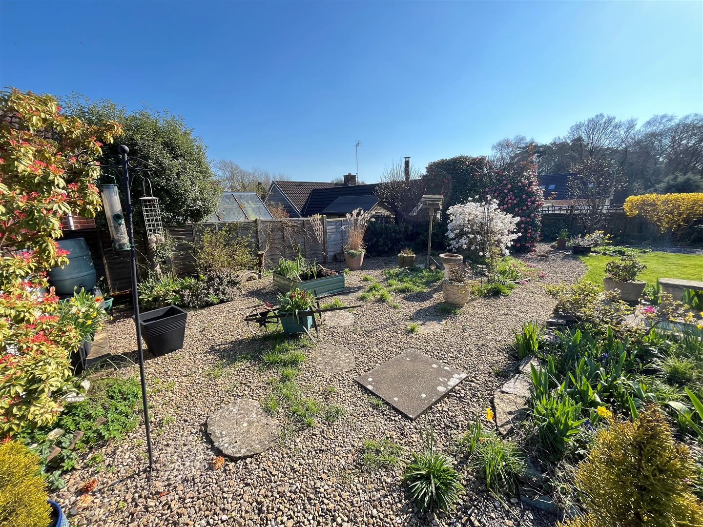 To the front of the bungalow is an expansive tarmacadam drive and turning/parking area for 4/5 cars comfortably. Attractive stoned area of garden with range of planting, shaped area of lawn with flower bed all well enclosed by post and rail fencing and hedgerow. A brick paved driveway continues to the side of the bungalow partly covered by a car port, providing parking for another three vehicles and also providing access to the garage, high level gate to rear garden. Immediately outside the rear porch and conservatory is an expansive sandstone patio with pedestrian access to either side. Well stocked flower bed, garden shed and greenhouse. Beyond is a gravelled area with further range of planting and well stocked flower bed. Toward the far end of the garden is an area of lawn with mature ornamental trees and shrubs, gravelled seating area and screened garden shed.