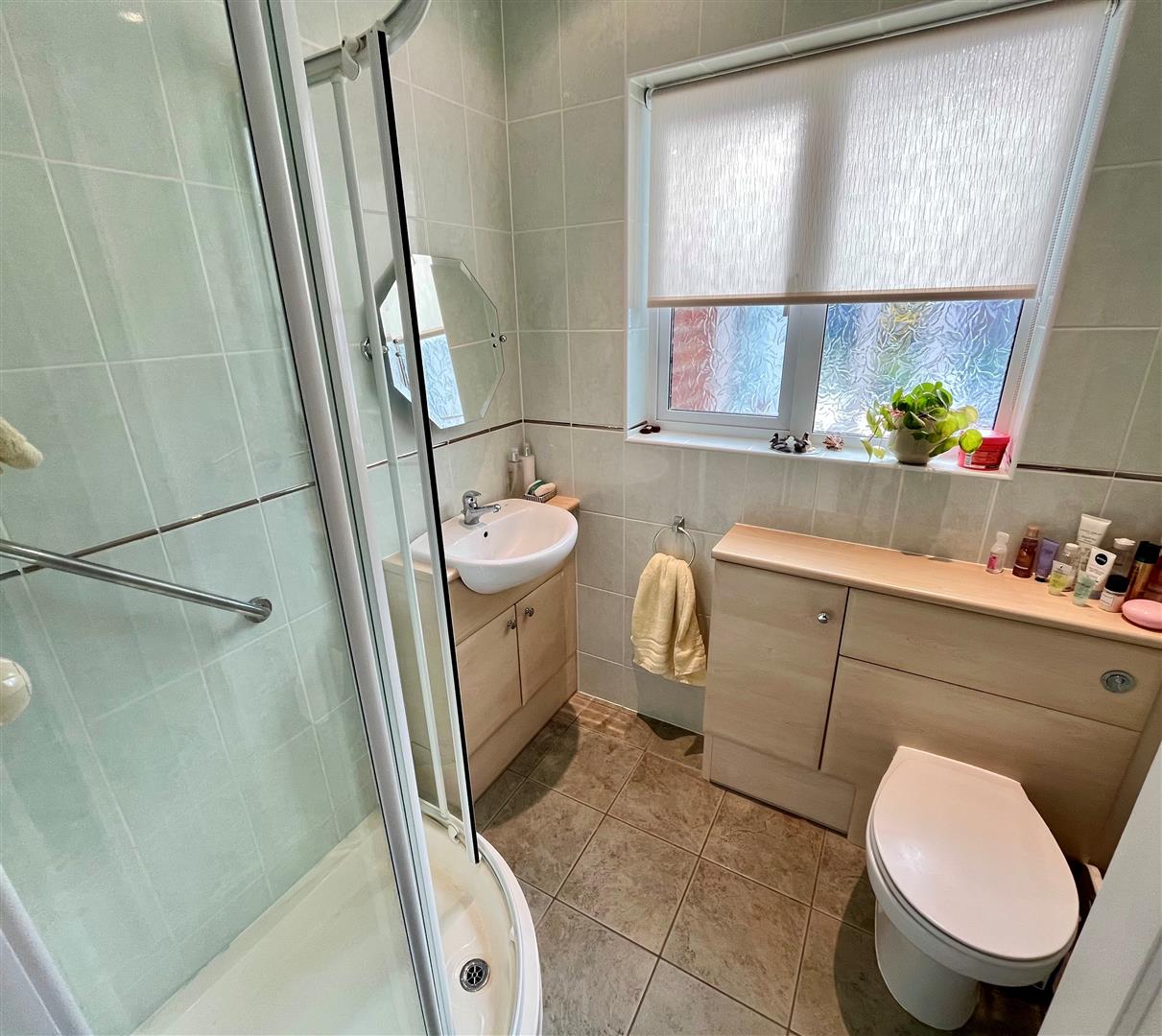 Modern, white suite comprising concealed cistern WC, vanity basin and corner shower enclosure with Mira thermostatic shower. Tiled walls and floor, heated towel rail and obscure double glazed window.