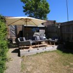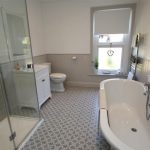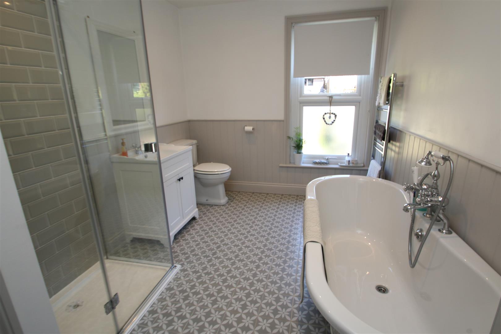 Lovely white suite comprising WC, vanity basin, freestanding bath and walk-in shower enclosure with tiled splashbacks. Feature wall paneling, tiled floor, heated towel rail, obscure double glazed window and ceiling spotlights. Full height cupboard housing Ideal gas boiler, shelving and space for tumble dryer.