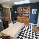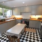 Matching shaker style wall and base units with solid wooden worksurface. Inset ceramic sink unit with mixer tap, space for range cooker, American style fridge/freezer, built in dishwasher and washing machine. Double glazed door and window overlooking the rear garden. Roof-light, vertical radiator and ceiling spotlights.