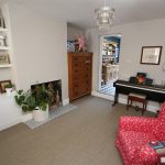 Double glazed sash style window to front. Inset log burner with slate hearth. Range of built in low level cupboards and recess shelving. Radiator. Feature fireplace with tiled hearth. Understair cupboard, radiators.